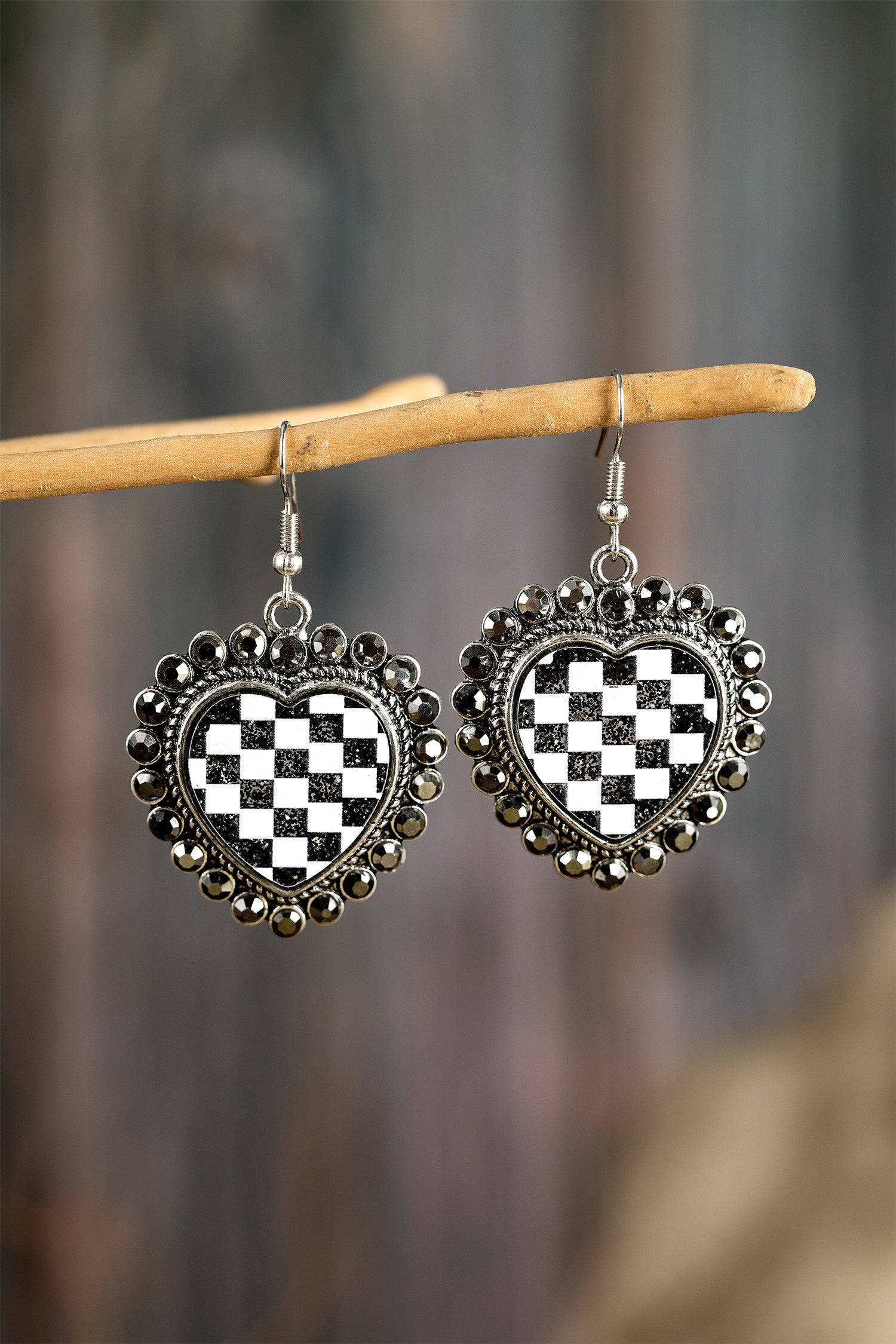 Add a touch of vintage charm to any outfit with our Checkered Heart Stud Earrings FB. Featuring a stunning checkered pattern and beautifully framed with sparkling crystal stones, these earrings are sure to make a statement. With their classic drop-style and comfortable French hook backs, they are perfect for any occasion, from casual days to dressed-up occasions.