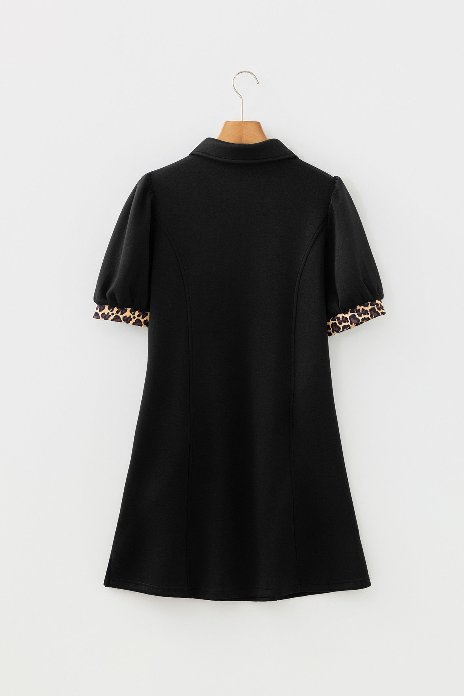 Elevate your wardrobe with this striking Leopard Patchwork Zip Mini Dress. Featuring a bold black leopard print mixed with complementary patchwork panels, this piece delivers instant style impact. The collared neckline and short puff sleeves add a playful, contemporary edge, while the front zip closure offers easy styling versatility. Cut as a flattering shift silhouette, this mini dress transitions seamlessly from casual outings to night-out ready looks. Perfect for fashion-forward shoppers who refuse to blend in, this ready-to-ship design combines animal print attitude with modern construction for a dress that truly stands out.